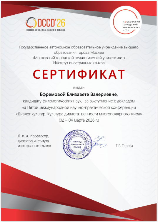 4 марта 2026 года директор НИИ ОППЛ «Устроение», кандидат филологических наук Елизавета Валерьевна Ефремова выступила на научной конференции DCCD’26 — «Диалог культур. Культура диалога: ценности многополярного мира».